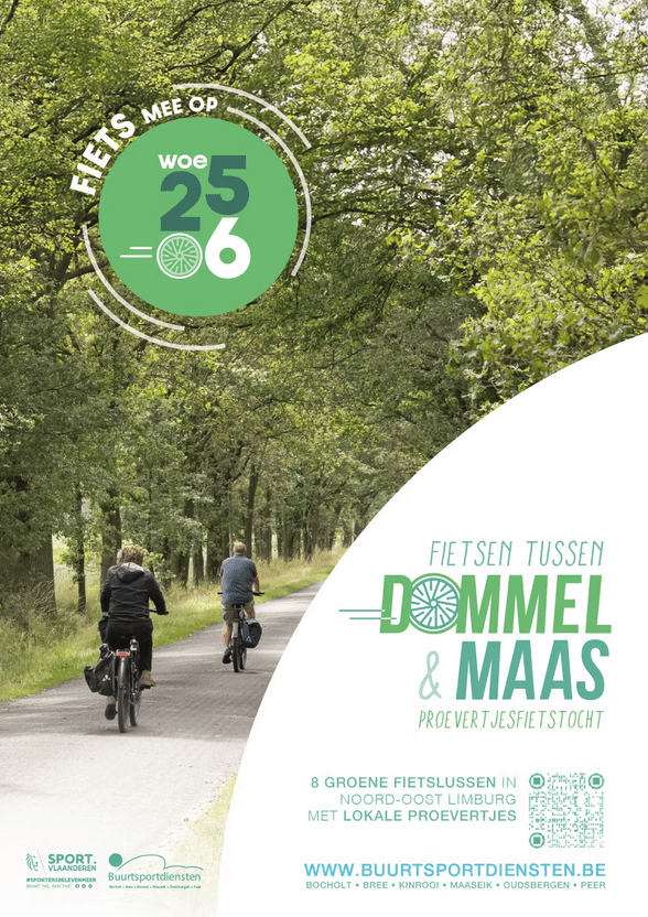 Am Mittwoch, dem 26. Juni, können Sie den ganzen Tag auf der neuen ausgeschilderten Radtour zwischen Dommel und Maas mitfahren. Unter der Leitung der 6 Nachbarschaftssportgemeinschaften radeln Sie an stimmungsvollen Orten in Kinrooi, Maaseik, Bocholt, Bree, Peer und Oudsbergen vorbei. Startpunkt in Kinrooi ist De Spaenjerd. Hier können Sie sich anmelden und zwischen 4 verschiedenen Strecken wählen: 28, 48, 68 oder 90 km. Sie zahlen 4 Euro und erhalten eine Stempelkarte und 2 Gutscheine für 2 Verkostungen Ihrer Wahl entlang der Strecke. An 6 Haltestellen können Sie sich abstempeln lassen und die Verkostung genießen. Wenn Sie Ihre Stempelkarte an der letzten Station abgeben, haben Sie die Chance, einen schönen Tombolapreis zu gewinnen.