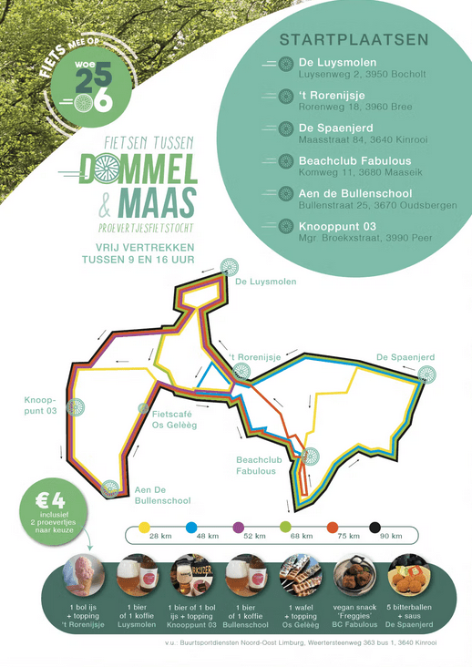 Le mercredi 26 juin, vous pourrez rouler toute la journée sur le nouveau circuit cycliste balisé entre Dommel et Maas. Sous la houlette des six communautés sportives de quartier, vous passerez par des sites atmosphériques à Kinrooi, Maaseik, Bocholt, Bree, Peer et Oudsbergen. Le point de départ à Kinrooi se trouve à De Spaenjerd. Vous pouvez vous y inscrire et choisir parmi 4 distances différentes: 28, 48, 68 ou 90 km. Vous payez 4 euros et recevez une carte de tampons et 2 jetons pour 2 dégustations de votre choix le long du parcours. A 6 arrêts, vous pouvez vous faire tamponner et profiter de la dégustation. A la dernière étape, vous remettez votre carte de compostage et vous avez la possibilité de gagner un joli lot de tombola.